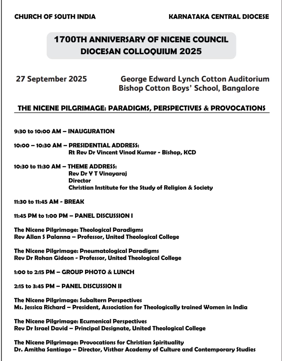 In celebration of the 1700th anniversary of the First Council of Nicaea (AD 325–2025), the Karnataka Central Diocese of the Church of South India hosted a Diocesan Colloquium titled “The Nicene Pilgrimage: Paradigms, Perspectives & Provocations” on 27 September 2025 at Bishop Cotton Boys’ School, Bangalore.